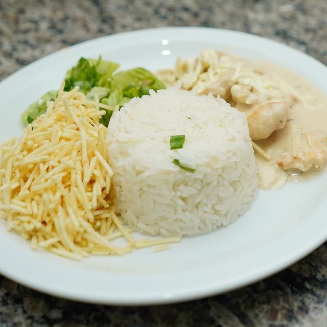 Arroz branco, filé de frango ao molho de requeijão, batata palha e salada