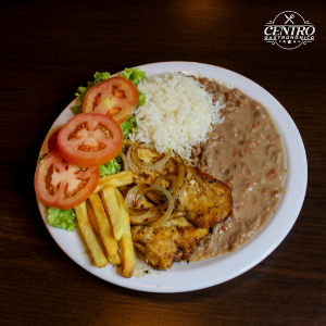 Arroz branco, filé de frango acebolado, feijão de caldo e salada de alface com tomate