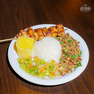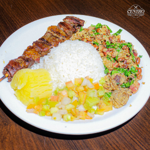 Arroz branco, filé de tilápia empanada, purê de mandioca com queijo muçarela e salada vinagrete